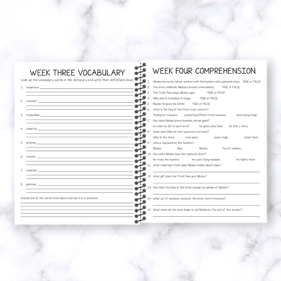 Bring holiday magic into your homeschool with our A Boy Called Christmas Novel Study. This engaging literature guide helps your child dive deeper into Matt Haigโs whimsical origin story of Father Christmas through meaningful comprehension work, creative activities, and cross-curricular learning. With vocabulary practice, daily questions, copywork, writing prompts, hands-on projects, and a book versus movie comparison, this study makes reading feel joyful and memorable all season long.