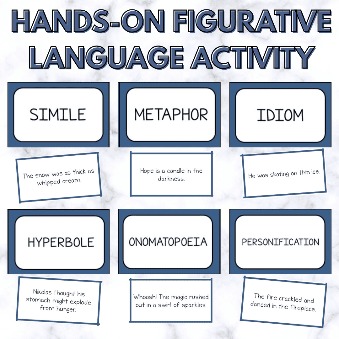 Scavenger hunts, matching games, and real examples from the book teach literary terms like simile, metaphor, hyperbole, personification, and more.