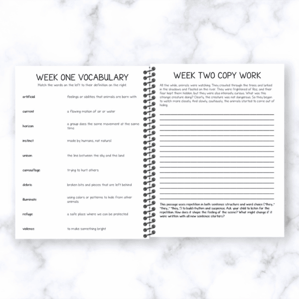 5 weeks of structured lessons with daily activities: copywork, vocabulary, writing, comprehension, and summary work—plus a 6th week for review and final projects.