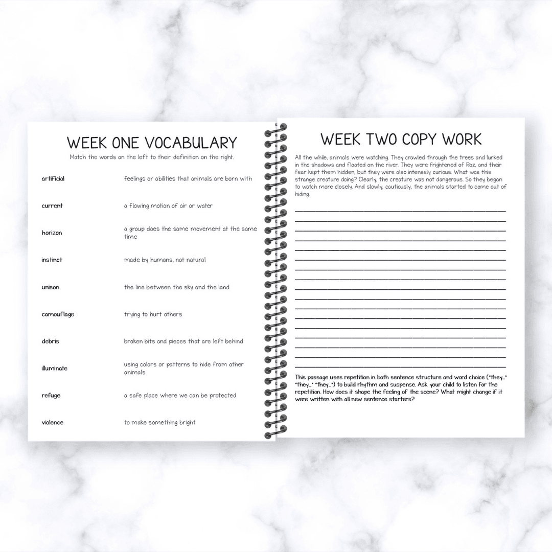 5 weeks of structured lessons with daily activities: copywork, vocabulary, writing, comprehension, and summary workโplus a 6th week for review and final projects.