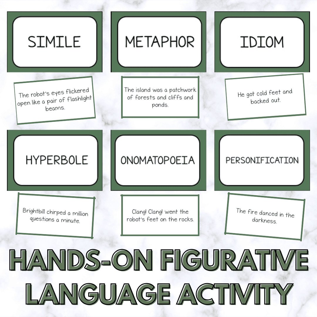 Scavenger hunts, matching games, and real examples from the book teach literary terms like simile, metaphor, hyperbole, personification, and more.